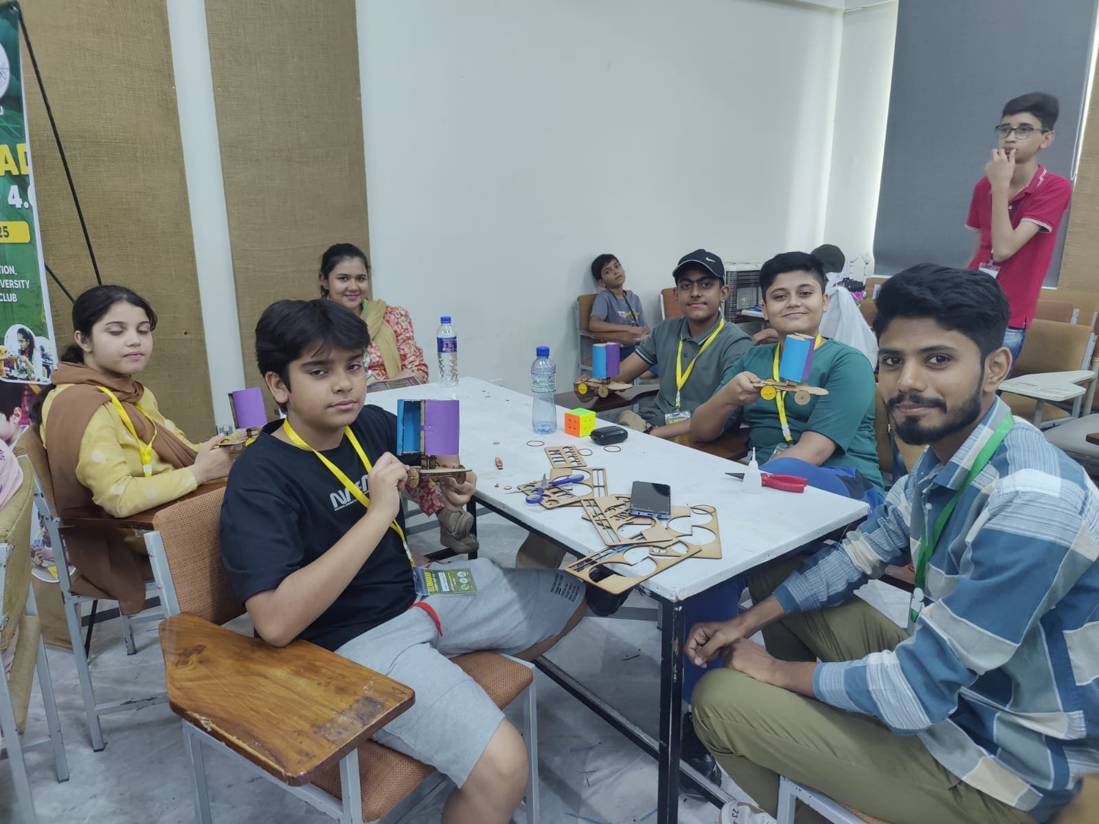- Children assembling wind-powered cars at Islamabad STEM Camp 4.0 in Pakistan
